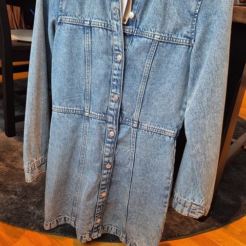 Custommade hverdagskjole for dame i størrelse 40. Kjolen er blå og laget i denim/ dongeri , egnet som hverdagskjole/ eller fint. Modellen har knappelukking i front og krage, samt lange ermer med mansjetter og knapper. Passer til bruk i hverdagen eller til uformelle anledninger.