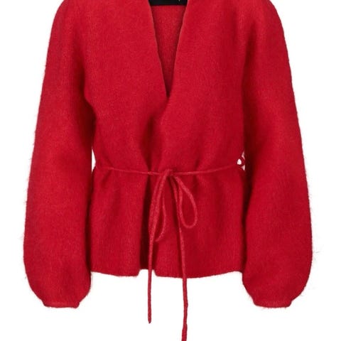 Strikk: mohairullblanding (72 % mohair, 26 % nylon, 2 % spandex). Modellen har omslagssnitt med knytebelte i livet og lange, voluminøse ermer. Myk og lett strikk.