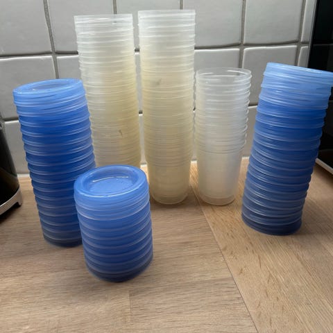Små gjennomsiktige plastkopper som er stablebare og tar liten plass ved oppbevaring. Passer til melkeoppbevaring eller mat i fryser. Godt brukt, noen har dato/skrift på seg