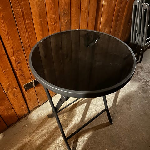 Rundt sidebord i svart metall. Bordet har tynn, rund bordplate med opphøyd kant og et enkelt understell med fire bein og kryss-stag for stabilitet. Egner seg som avlastningsbord eller lite bord i stue, gang eller andre oppholdsrom.