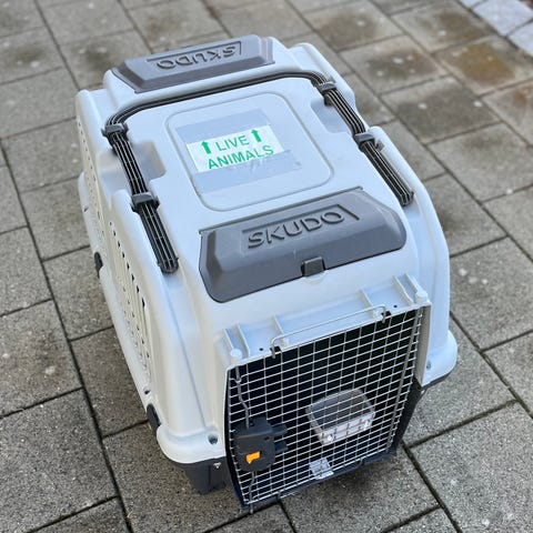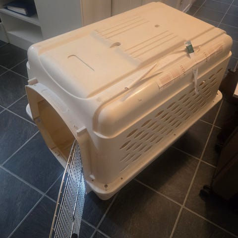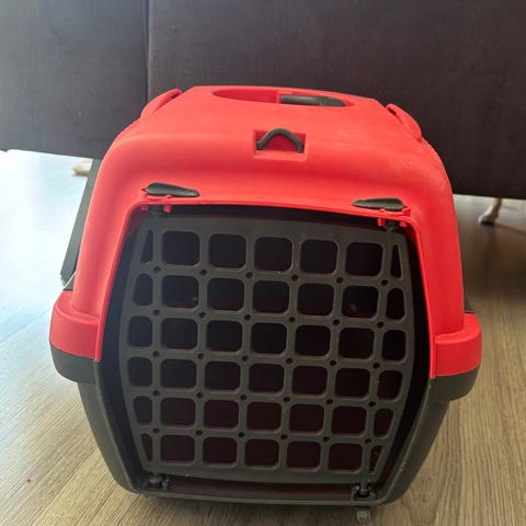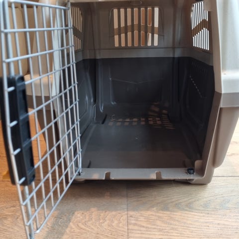Petmate transportbur til katt eller liten hund i hardplast. Buret har ventilasjonsåpninger på sidene og i toppen, samt metallgitter i toppen for ekstra lufting og innsyn. Farge er beige. Egner seg til transport av mindre kjæledyr i bil eller på korte reiser, og kan også brukes som hvileplass hjemme. Plastmaterialet er enkelt å rengjøre og tåler normal bruk.