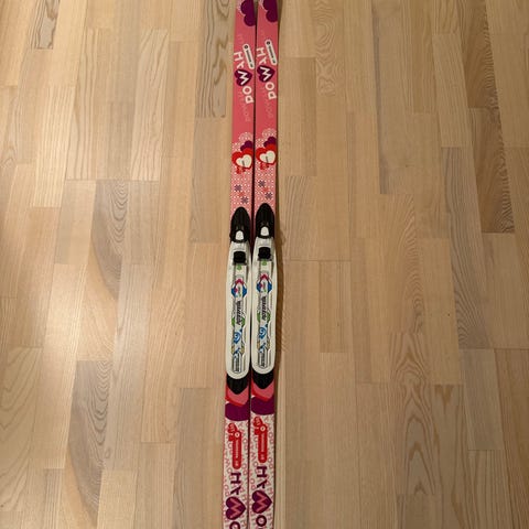 Rossignol Pow’Her barneski på 90 cm i rosa/hvitt mønster. Skiene har integrerte bindinger til klassisk langrenn for barn. Med følger et par lette barne-skistaver med blå håndtak.