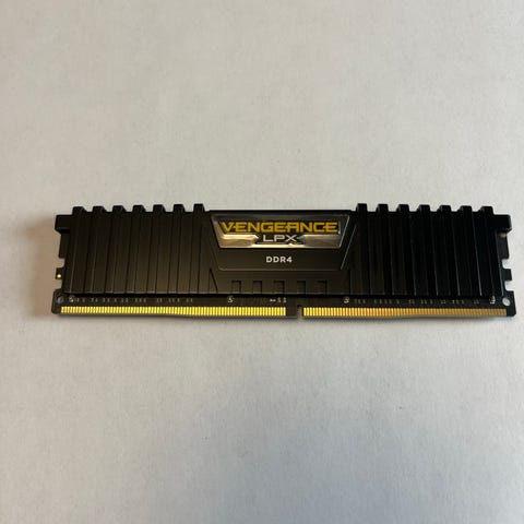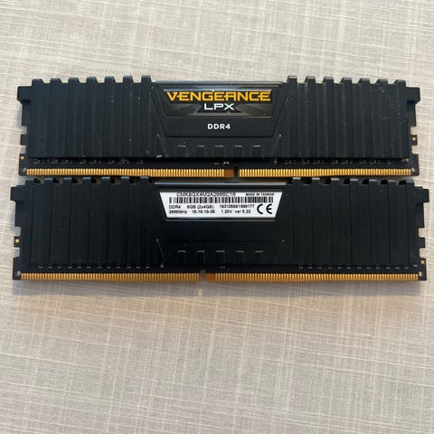 Corsair Vengeance DDR4 RAM-modul med kapasitet på 8 GB og hastighet på 2666 MHz. Modellen er CMK8GX4M1A2666C16 med svart kjøleribbe. Passer til hovedkort som støtter DDR4-minne og denne hastigheten. Egnet som oppgradering eller erstatning av eksisterende RAM i stasjonær PC.