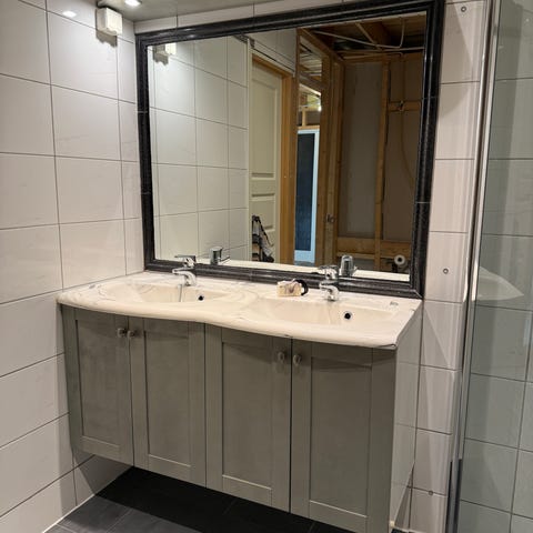 Dobbelvask, speilskap og et høyskap.