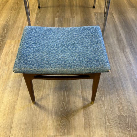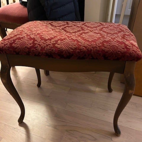 Pen krakk med lilla ulltrekk. Pene ben i brunt tre. 44 bred, 43 høy, 32 dyp. Må hentes.
