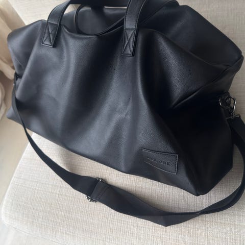 Rains bag i kunstlær for unisex. Vesken har et ytterstoff i glatt, vannavstøtende kunstlær og et lyst, stripet innerfôr. Den har doble bærehåndtak og avtakbar skulderrem som festes med karabinkroker. Innvendig er det flere rom og glidelåslommer for organisering av innhold. Egnet som weekendbag, reisebag eller til oppbevaring av klær og utstyr i hverdagen.