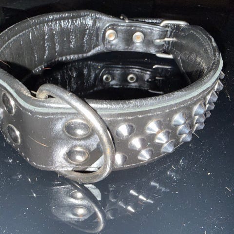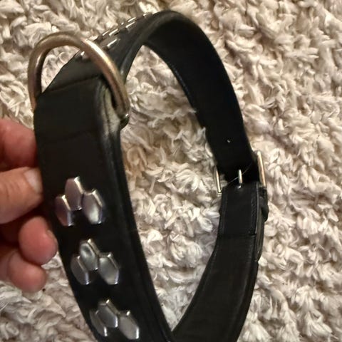 Lærhalsbånd til hund i brun farge med metalldekorasjoner. Halsbåndet har bred utforming og polstret innside for økt komfort. Utstyrt med metallring for feste av kobbel. Passer til hund, egnet spesielt for raser med kraftig hals på grunn av den brede utformingen.
