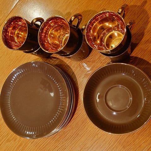 Pent brukt servise fra Figgjo. Mangler tre av de største fatene, men ellers er det seks kopper og seks små fat. Pris kan diskuteres 😊😊