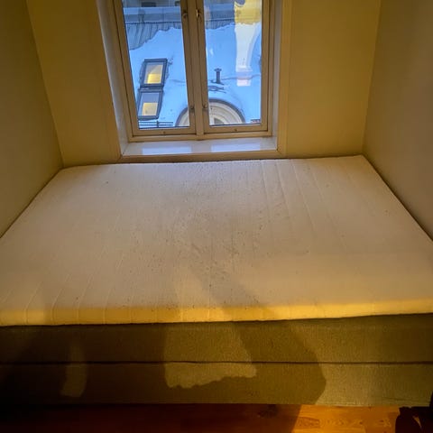 Jysk seng med madrass Dream Zone,beige tekstiltrekk. Sengen har rektangulær form og står på ben i tre. Madrassen har vattert overflate med rutemønster. Egner seg som enkeltseng på soverom/gjesterom.