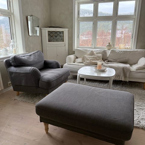 Pene og lite brukte hjørnestoler i rutete ullstoff kjøpt på Bohus for noen år siden. Har stått i loftstue, ingen bruksmerker. Kan også plasseres sammen mot hverandre for en sofafølelse.