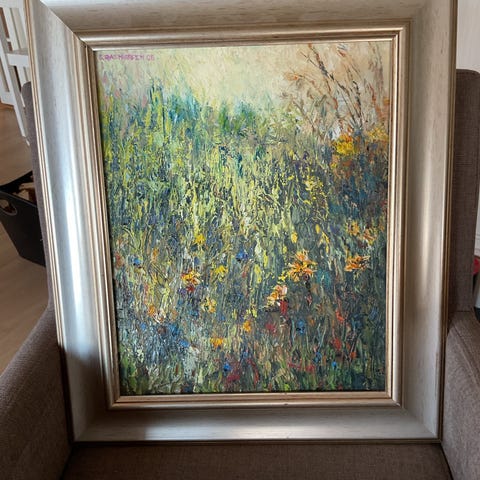 Signert maleri med gatemotiv som viser bygård, trær, biler og mennesker i en urban høstscene. Fargene domineres av grønne, gule og brune toner. Bildet er innrammet i en profilert brun treramme. Kunstnerens signatur og årstall er synlig nederst i bildet. Passer som veggdekor i stue, gang eller kontor. Malt av Svein Rasmussen 2005. 45x55