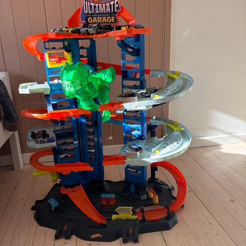 Hot Wheels Ultimate Garage bilbane lekesett. Stor vertikal bilbane med flere etasjer, spiralformede nedkjøringer og loop. Innebygde ramper, parkeringsplasser og kjørespor for små lekebiler fra Hot Wheels-serien. Plastkonstruksjon i hovedsak i grå, oransje, blå og svarte deler. Passer til standard Hot Wheels-biler (ikke inkludert dersom ikke annet er oppgitt i annonsen). Egnet som lekesett for barn som liker bilbaner og kjøretøy.