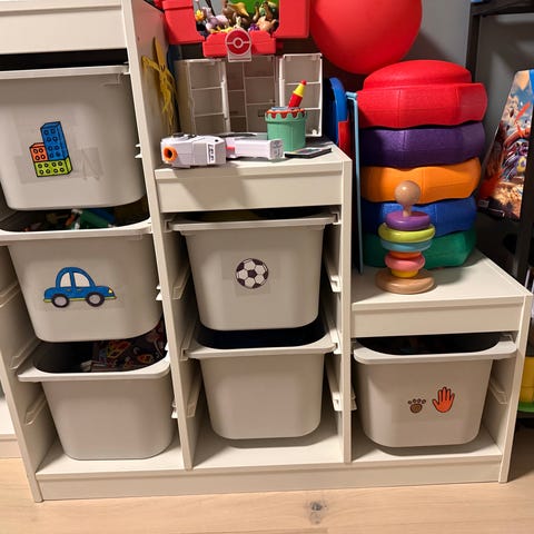 IKEA Trofast oppbevaringsstativ med plastkasser hvit grønn rosa rød