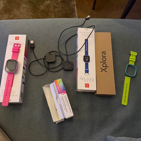 2x Xplora X4 smartklokke for barn i fargene navy blå og rosa. Klokkene har reim i myk plast/silikon med justerbar lengde og klassisk spenne. Modellen Xplora 4 er utviklet for barn og har fargeskjerm og berøringsskjerm. Klokkene leveres med ladekontakter på baksiden og CE-merking. Egner seg som aktivitets- og kommunikasjonsklokke for barn, avhengig av funksjoner som er aktivert via tilhørende tjeneste og app.