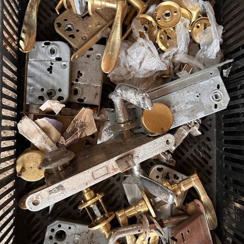 Blandet parti med dørhåndtak og beslag i metall. Inneholder ulike typer håndtak, skilt, hengsler og hjul i hovedsak i messing- og stålfarget utførelse. Delene har varierende utforming og størrelse, og kan egne seg som reservedeler eller til gjenbruk i prosjekter hvor det trengs ulike typer dør- og møbelbeslag. Selger hele kassen med alt innhold slik det er på bildet