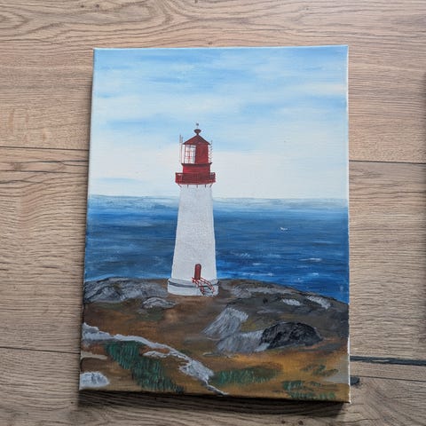 Motiv av et fyrtårn i rolige blå- og naturtoner – passer perfekt i stue, hytte, gang eller kontor.