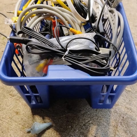 diverse kabler og ledninger. Pakken inneholder ulike typer kabler i hovedsak for elektronikk og lyd/bilde-utstyr. Det er flere svarte kabler med ulike kontakter, samt en lengre rull med kobberfarget kabel og en bunt med hvit kabel. Egner seg til tilkobling og oppsett av forskjellig elektronikk der kompatible kontakter og lengder passer brukerens behov. Nøyaktig type og lengde på kablene fremgår av bildene. Alt selges samlet.