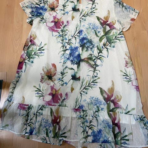 Zizzi sommerkjole for dame i størrelse M. Kjolen er blå og laget i polyester. Modellen har løs passform med lett, fallende stoff og transparent ytterlag nederst. Egnet som enkel sommerkjole eller til bruk ved ulike anledninger der en lett og luftig kjole ønskes. Kjolen er 25 cm lengre bak enn foran. Kjolen er totalt 115cm lang kjolen går opp i en bue foran . Under kjolen kommer litt nedfor foran på ytterste kjolestoffet (se bilde ) Vidde under armene er 80 cm .