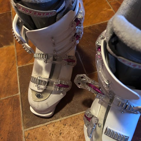 Brukte hvite alpintstøvler.