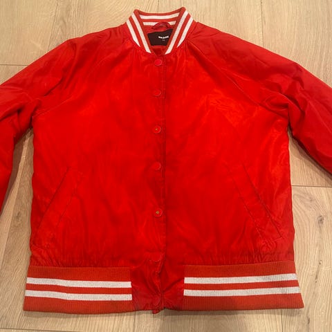 Rød jakke med gulldetaljer fra Monki selges. Lett vattert. Pent og lite brukt. Str. small, men oversized, så passer en medium. Hentes i Fredrikstad eller sendes mot at kjøper betaler frakt.