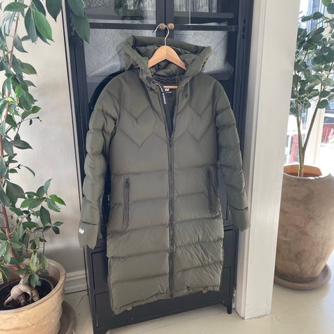 Jakken er grønn og laget i polyester. Glidelåslukking foran, høy krage og gjennomgående vatterte sømmer. Den har lommer i sidene og glidelås i sidene nederst for bedre bevegelse og tilpasning. Lekker & ekstra lang;