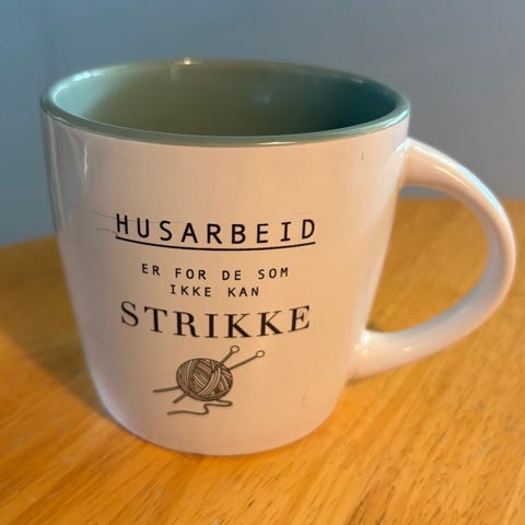 kopper med tekstmotiv «Strikking er en av livets gleder». Kopp i keramikk med hank, egnet til varme drikker som kaffe, te eller kakao. Nøytral lys farge med trykket tekst i kontrastfarger på utsiden. Passer til bruk på kjøkken, kontor eller som gave til en som liker strikking.