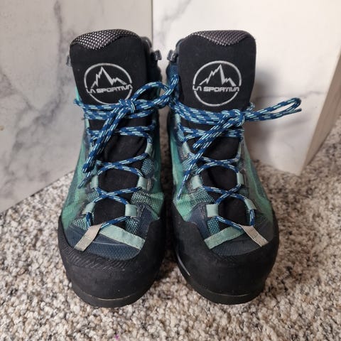 Arc’teryx tursko i størrelse 40 for fottur. Modellen er en ankelhøy tursko med snøring og kraftig yttersåle med grovt mønster. Skoene er i hovedsak svarte med blå detaljer og lisser. Overdelen er i syntetisk materiale med forsterkninger rundt tå og hæl. Skoene er egnet til fotturer og annen bruk i terreng der det er behov for stabile og robuste sko.