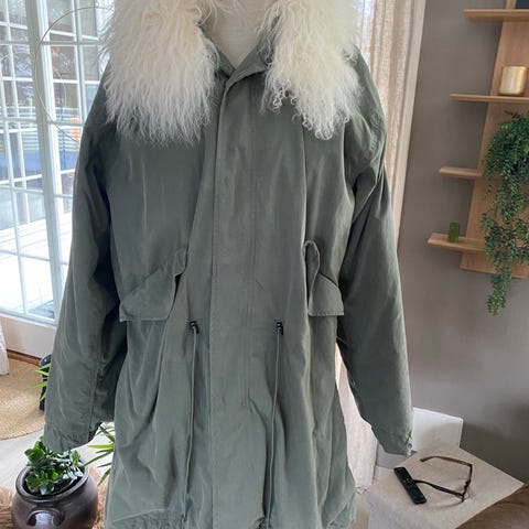 Haust vinterjakke for dame i størrelse 38. Jakken er army grønn og laget i bomullsmateriale. Den har stor krage med lys, myk pelsimitasjon, frontlukking med glidelås og knappestolpe, samt justerbar lukking i halsen. Modellen har store frontlommer og snøring nederst for bedre tilpasning. Egnet som ytterjakke i den kaldere sesongen.