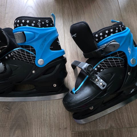 Pro Flyer justerbare ishockeyskøyter for barn i størrelse 38-41. Skøytene har hard plastyttersko i svart med blå og grønne detaljer, samt polstret innersko for økt komfort. Lukkes med justerbare spenner over vrist og ankel for stabilitet og enkel tilpasning. Egnet til ishockey og generell bruk på is for barn i angitt skostørrelse.