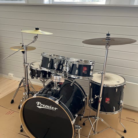 Selger en moderne klassiker: Et originalt Premier Genista trommesett fra midten av 90-tallet, produsert i England.