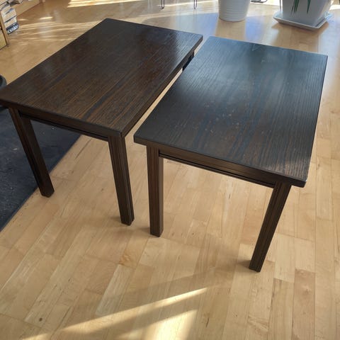 P.S. Heggen bord mahogni /palisander tre, produsert i Norge. Rektangulær bordplate med synlig trestruktur og brun finish. Bordet har rette, avsmalnende ben i tre. Understellet er merket med «P.S. Heggen Nordfjordeid – Made in Norway». tror det er fra 80 tallet, har 2 like bord, det ene har et lite hakk, se bildet, ikke så synlig, helt og fint kr, 1400 pr stykk