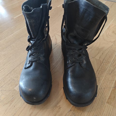 Størrelse 45. Svart skinn. Skoreim mangler på den ene skoen.
