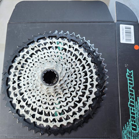 Bildene viser en kassett til sykkelgir, samt flere bremseskiver for skivebremser. Kassetten har flere drev i stål med rød bærer i midten. Bremseskivene er runde skiver med hullmønster for montering på nav med skivebremser.