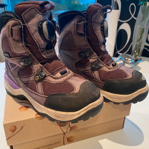 Selger to par vintersko. Ecco gore tex str 32, og vannavvisende glitter "uggs" str 33. Brukt samtidig mtp størrelse. Skoa er pent brukt, men Ecco skoa har en liten skade i ene leppa som er reparert (vises på bildet) - og glitter uggsa en liten slitasje på ene skotuppen. Ellers ingenting å utsette på dem. Ecco er nyimpregnert. Selges samlet for 250 kr. Kan sendes.