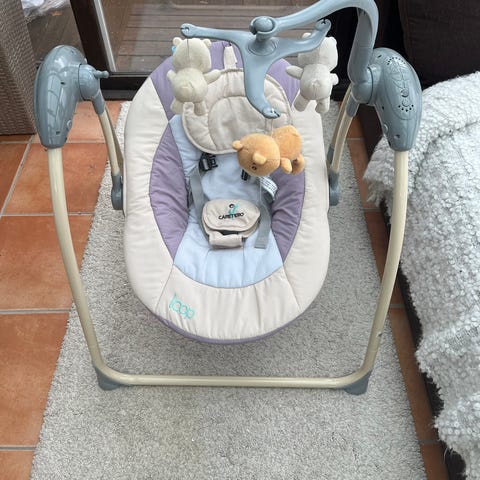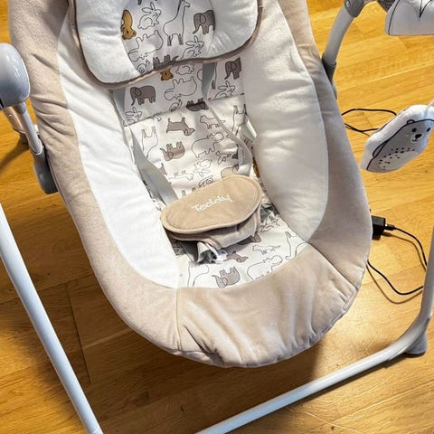 Elektrisk babygynge i rosa og hvit farge. Setet har myk polstret pute og justerbar sikkerhetssele. Bøylen over setet har hengende mykleker for visuell stimulering. På siden av rammen er det betjeningspanel med knapper for blant annet av/på og justering av funksjoner. Gynge egner seg til spedbarn og små barn som trenger støtte når de sitter eller ligger, og kan brukes innendørs på stabilt underlag.