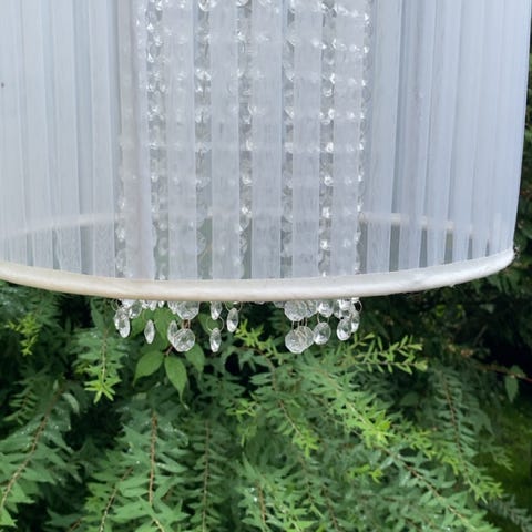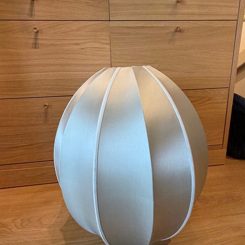 Stor avlan/rund lampe i beige/gull stoff. Gir nydelig lys.