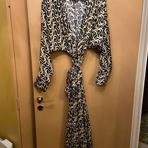 Nydelig Sissel Edelbo silkekimono selges rimelig på grunn av flekker som ikke gikk bort ved håndvask.