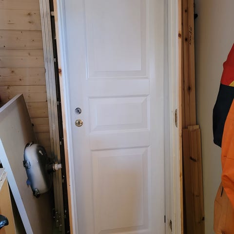 Innerdør i treverk, trolig furu, med klassisk profilert utførelse. Døren har tre fyllinger og leveres med dørhåndtak og låskasse montert. Egnet som innerdør i bolig, hytte eller andre innendørs rom der man ønsker en tradisjonell tredør. Eventuelle mål og hengsling bør kontrolleres ved henting eller etter avtale med selger.