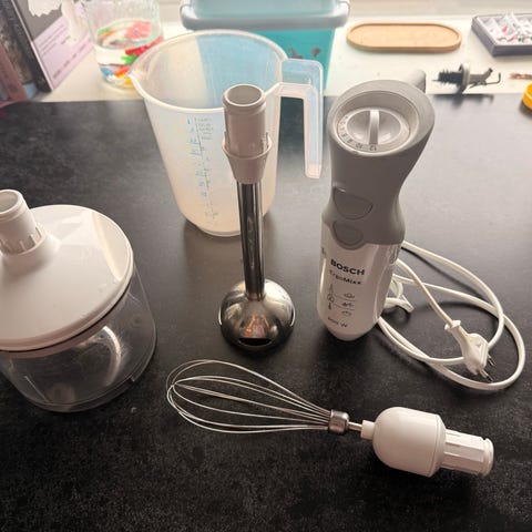 Philips stavmikser på 600 watt. Settet består av motorenhet, avtakbart stavmikserhode med knivblad i metall, ballongvisp og hakkerbolle med lokk.