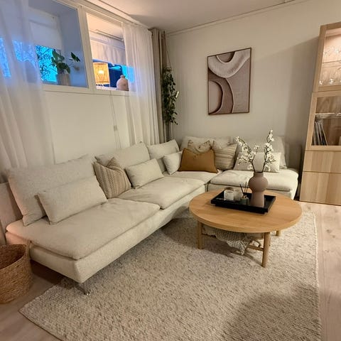 Søderhamn sofa med 3 trekk+ sjeselong og to armlener. Trekkene er i Viarp beige/brun, Tallmyra hvit/svart/grå og et i mørkegrått. Det mørkegråe selges ikke lenger på IKEA. Trekk til sjeselong er med kun i fargen mørkegrå, og heller ikke i fargen Viarp beige/brun til armlenene, men kan kjøpes på Ikea. En av hver glidelås på to sitteputer av de mørkegråe trekkene er i stykker, men går fint å bruke de allikevel.