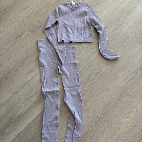 Levity yogasett/treningsett selges da det ble for lite til meg, aldri brukt, eneste er at jeg har klippet vekk stikken på innsiden av toppen da den var veldig stram. Fargen er sage green. Stoffet minner veldig om hm sin softemove kolleksjon🩷