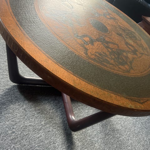 Gammelt bord med en fin kobberplate på .