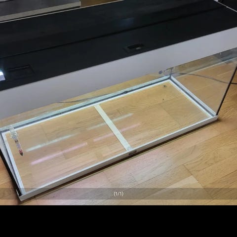 Akvariet på toppen er et rektangulært glassakvarium fra Akvastabil Effect-Line-serien med mål 50 x 30 x 30 cm. Det står på et åpent metallstativ med trehylle nederst. På nederste hylle står et ekstra mindre glassakvarium/kar, også rektangulært.