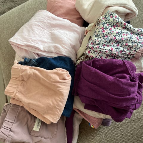 Babyklær for jente i størrelse 62 i flerfargede toner. Pakken inneholder ulike plagg som bodyer, bukser, heldresser og kjole, smekker, sokker, ullsokker og strømpebukser. Klærne er fra newbie, h&m, hust & claire, lindex, cubus og kappahl.