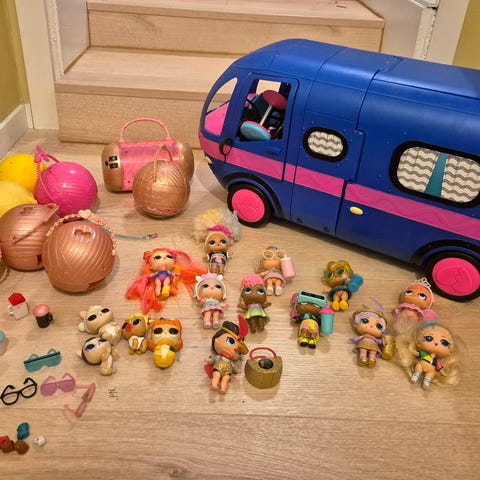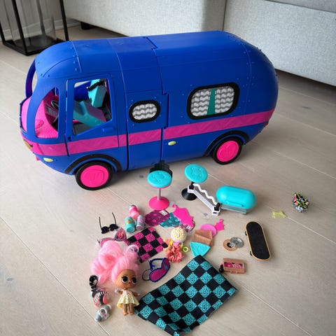 L.O.L. Surprise OMG bobil lekesett i turkis og rosa plast. Bobilen kan åpnes og brettes ut til et lekesett med flere soner, blant annet sitteområde, liten scene eller dansegulv, og ulike innredningsdetaljer. Fronten har førerplass med ratt og seter, og bakdelen har uttrekkbar del med ekstra lekeflate. Egnet som lekesett for L.O.L. Surprise-dukker og lignende små figurer.