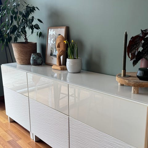Skjenk satt sammen av tre enkle Bestå-moduler / skap og én dobbel. Se bilde 4 og 5 for mål. Masse oppbevaringsplass. Kjøpt i mai i fjor og selges pga. flytting.