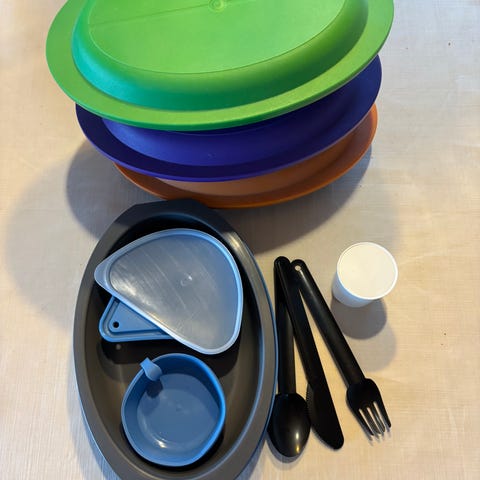 Inkl 2 tellerken, spiseskje og 2 kopper + gryte