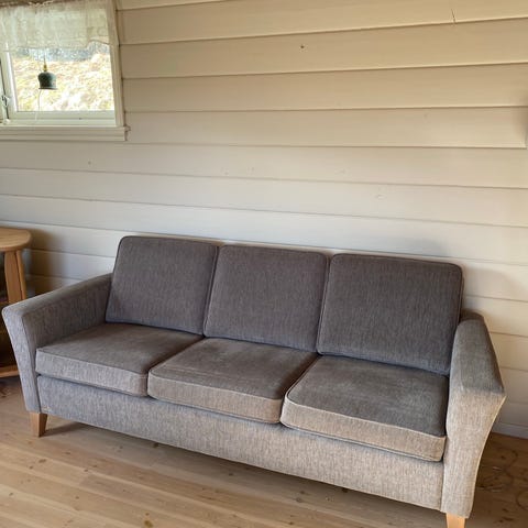 Bing & Grøndahl sofa i brun tekstil. Sofaen har tre sitteputer og tre ryggputer, samt avrundede armlener og kappe nederst. Trekket fremstår som et strukturert stoff i en brun/grønn tone. Putene er løse og kan tas av for enklere rengjøring og ommøblering. Passer som sittemøbel i stue, kjellerstue eller hybel. 220 x 90 x h70