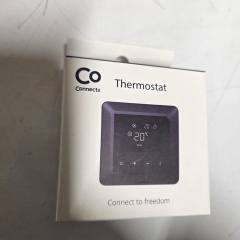 Canes BT-A RF romtermostat i hvit farge. Termostaten har dreiehjul for manuell innstilling av temperatur og indikator for trådløs RF-funksjon. Enheten er beregnet for styring av varme i et rom og leveres med tilhørende dokumentasjon som vist på bildene.
