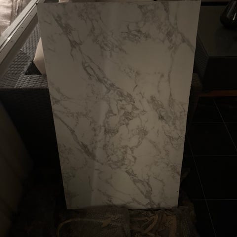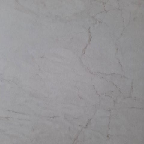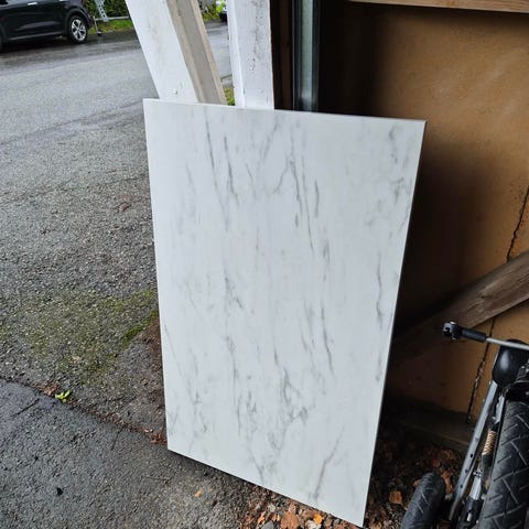 Hvit benkeplate med marmormønster i laminat. Overflaten har lys, marmorert struktur med grå årer. Egner seg som benkeplate på kjøkken, kontor eller arbeidsbenk. Kan tilpasses ved kapping etter ønskede mål. Laminatoverflaten er glatt og lett å rengjøre. Produsert av fibo. Kun ligget tørt i bord hos meg i 2 mnd aldri brukt.